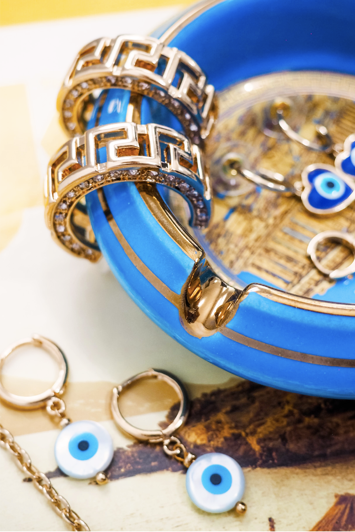 The Callas Hoops will have you entranced. These statement-hoops have a stunning meandros design with shimmering rhinestones along the sides.
