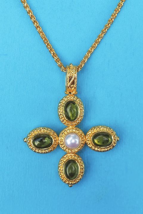Handcrafted in fine 925 silver with 18k gold plating with pearl and peridot stones.
