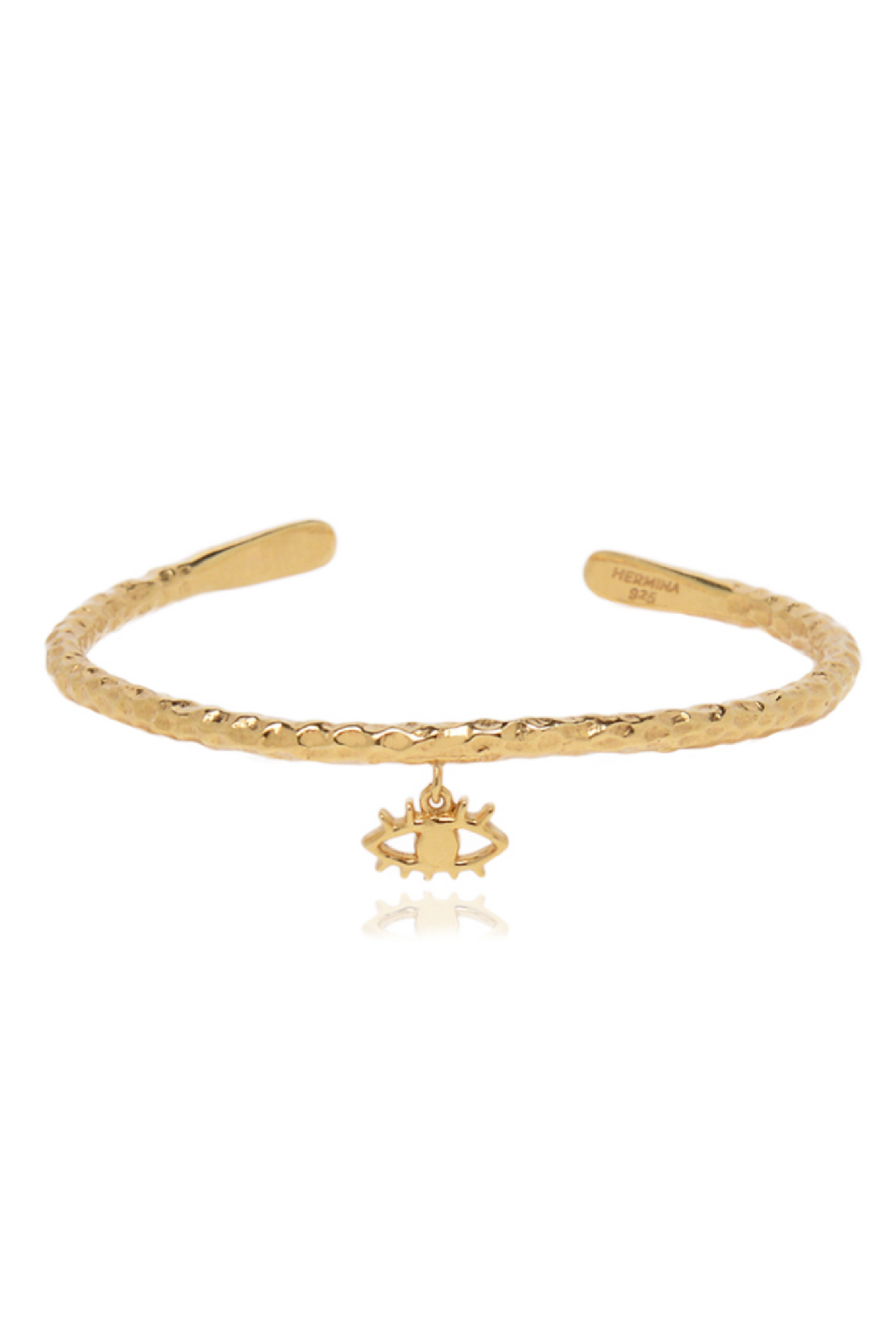 The Kressida Evil Eye in the form of a tiny charm hanging in the center of this gold hammered dreamy cuff.