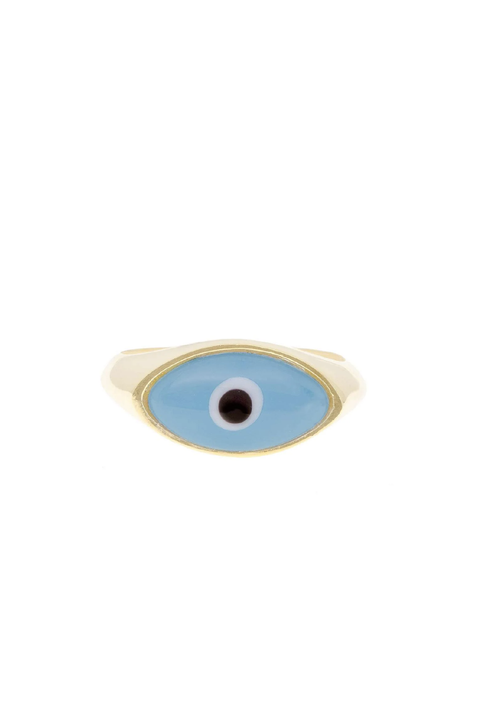 Give your digits the power to wave goodbye to negativity and beckon only admiring glances—light 'em up with this absolute classic in blue! Our fan favorite Evil Eye Ring is the good luck charm your wardrobe has been waiting, shining smartly with its invigorating sky blue evil eye lined in stately gold. Let your finger stacks start here and get ready to build a blinged-out dream that's totally, unmistakably you.